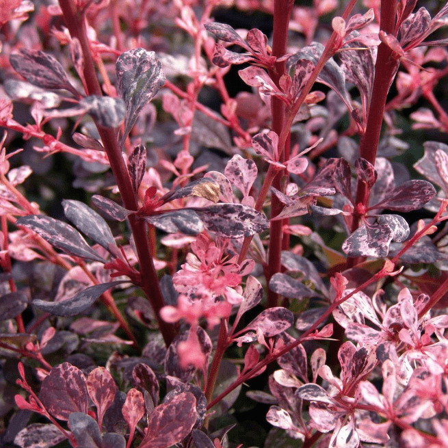 Саженцы барбариса Розетта (Rosetta) вырастают шаровидным кустарником около 40-60 сантиметров в высоту. Ветви изогнуты вниз, изящные, тоненькие и покрыты небольшими, острыми колючками. Листва небольшая, цельнокроеная. Молодые листики имеют ярко-пурпурный тон с розовато-серыми разводами, а взрослые листики темно-розового тона с сероватыми пятнами. Цветет желтыми цветочками, которые собраны в небольшие кисти. Достоинства барбариса Розетта: - высокая декоративность - редко болеет - засухоустойчивый Плоды созревают в сентябре и имеют алый тон окраса и продолговатую форму. Ягоды собраны в рыхлые кисти.