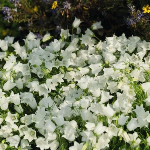 Рассада колокольчика Джингл Вайт (Jingle White) быстро разрастается. Имеет стелющиеся стебли с мелкой зеленой листвой. В высоту вырастает около 10-15 см. В июне зацветает небольшими белыми цветами звездчатой формы. Цветение продолжается все лето. Плюсы колокольчика Джингл Вайт: - зимостойкий - превосходно растет под солнечными лучами - требует редкого полива Семена колокольчика Джингл Вайт лучше сажать на рыхлой, дренированной почве и на солнечных местах. Однако хорошо приспосабливается к любым условиям. Широко используется в декорировании альпинариев, в одиночных посадках на фоне газона.