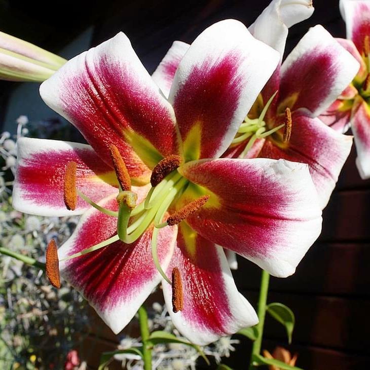 • Окраска цветка : бордово-малиновый с белым кантом и кончиками лепестков, пыльники ярко-оранжевые