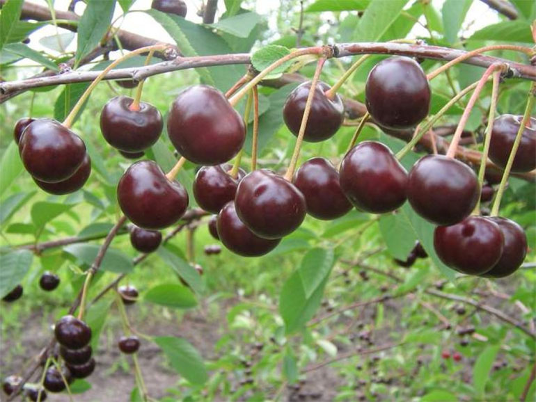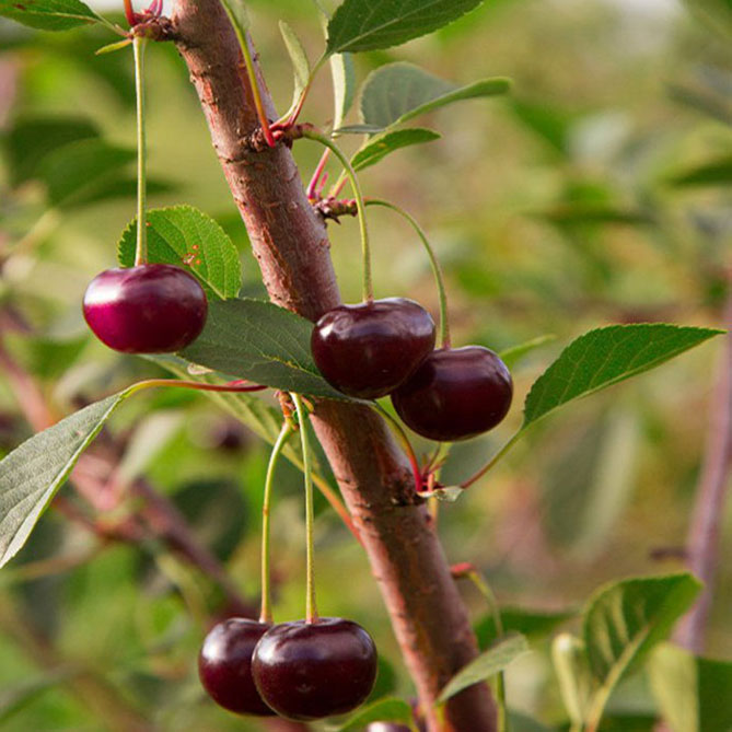 Саженцы вишни Владимирской – это многоствольное дерево, которое может вырастать до 3 – 5 метров. Кора серого цвета с трещинами и склонная к шелушению. Крона шарообразная, ветви слегка свисают вниз. Плоды вишни могут отличаться по размеру: от самых маленьких до средних, имеют плоскоокруглую форму. Если растение правильно привито, то урожай можно будет собирать на 2 – 3 год после посадки саженцев. Имеет средние сроки цветения и плодоношения, между которыми проходит около 2 месяцев. Ягоды сорта вишни Владимирской созревают в разное время, поэтому при запоздалом сборе урожая появляется риск осыпания.